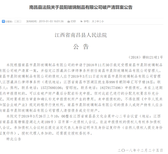 2019年1月,南昌县人民法院官网上披露一则消息显示,晨阳玻璃破产清算。