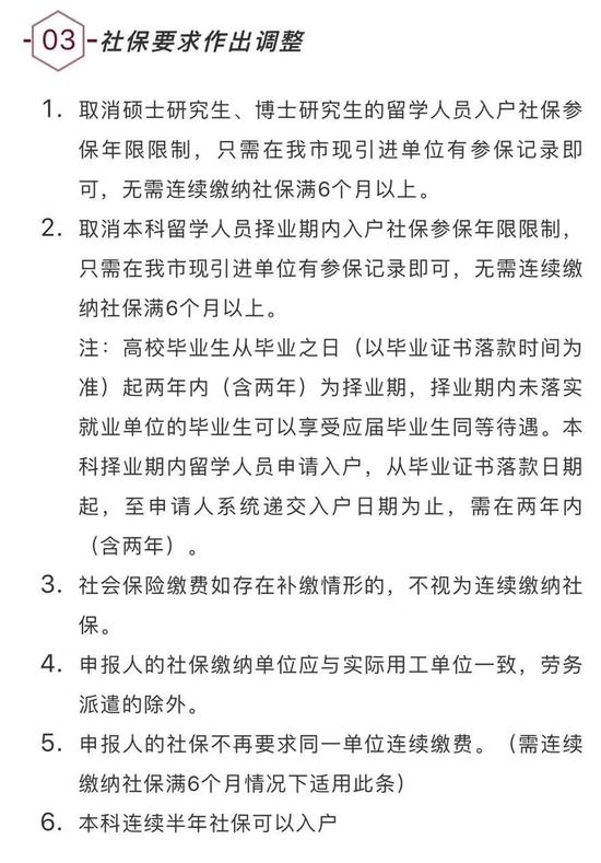 一是取消了硕士研究生、博士研究生的留学人员入户社保参保年限限制,只需在广州市现引进单位有参保记录即可,无须连续缴纳社保满6个月以上;二是本科连续半年社保就可以入户。
