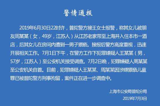 7月3日晚21点左右,上海市公安局普陀分局发布“警情通报”显示,2019年6月30日22时许,上海普陀警方接王女士报警,称其女儿被朋友周某某(女,49岁,江苏人)从江苏老家带至上海并入住本市一酒店,后其女儿在房间内遭到一男子猥亵。7月1日下午,在警方工作下犯罪嫌疑人王某某(男,57岁,江苏人)至公安机关接受调查。7月2日晚,犯罪嫌疑人周某某至公安机关自首。目前,犯罪嫌疑人王某某、周某某因涉嫌猥亵儿童罪已被普陀警方刑事拘留,案件正在进一步调查中。